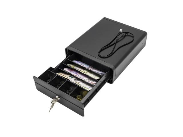 Сверхкомпактный денежный ящик с возможностью открытия через интерфейс RJ11 (с помощью импульса от чекового принтера или кассового аппарата). Этот ящик для денег благодаря своим небольшим размерам прекрасно подойдет для торговых точек, находящихся в ограниченном пространстве. Для экономии места используется вертикальный способ раскладки купюр с четырьмя полноразмерными отсеками для банкнот. Монетам назначены 4 отдельных отсека.