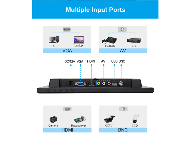 Сенсорный монитор ОТМ -1000С оснащен достаточно широким спектром портов подключения для вывода изображения, что фактически делает его универсальными и совместимыми с любым ПК, мини ПК (где например обычно может быть не предусмотрено VGA порта для подключения монитора), тогда можно использовать HDMI порт – благодаря которому воспроизведение изображения более четко. Монитор также оснащен BNC разъемом, что позволяет использовать монитор и в системах видеонаблюдения, а благодаря аудио выходу можно воспроизводить и звук.