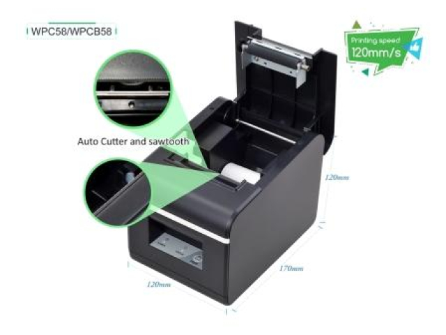 Настольный/Стационарный;; Термопечать;разр.печати, dpi: 203;ск.печ. до 120 мм/сек;;автообрезка: Да;;подкл.ден.ящ. Да;напряж.ден.ящ. 12В;интерф.подкл. USB;;шир.ленты, мм: 57.5 ± 0.5;макс.диам.рулона,мм: 83;Размер: 169,95 (Г) × 120 (Ш) × 119,92 (В) мм;;Масса 0.8 кг;