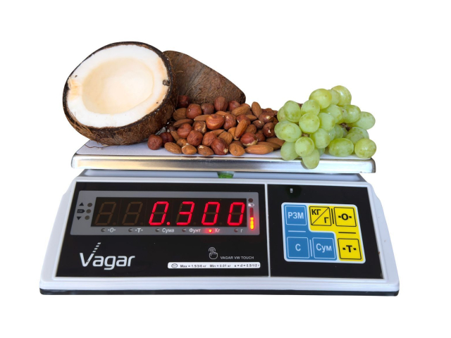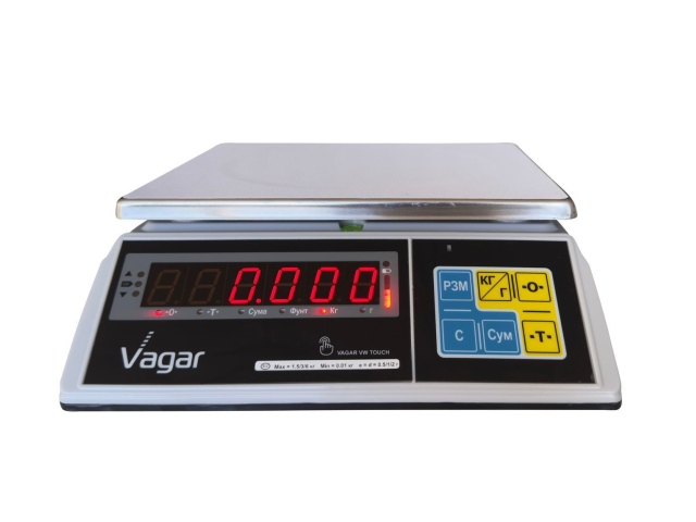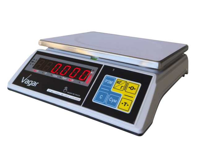 VAGAR VW TOUCH 1.5/3 кг-Фасовочные весы предназначены для взвешивания и фасовки товаров и различных материалов массой до 30 кг. Весы Vagar VW TOUCH имеют функцию, с помощью которой можно определить количественное выражение единиц (шт.) однотипного товара при взвешивании целой партии или произвольно выбранного количества. Взвесив одну единицу продукции и сохранив значение в памяти весов, последующие взвешивания укажут, какое количество продукции в штуках находится на грузоприемной платформе.