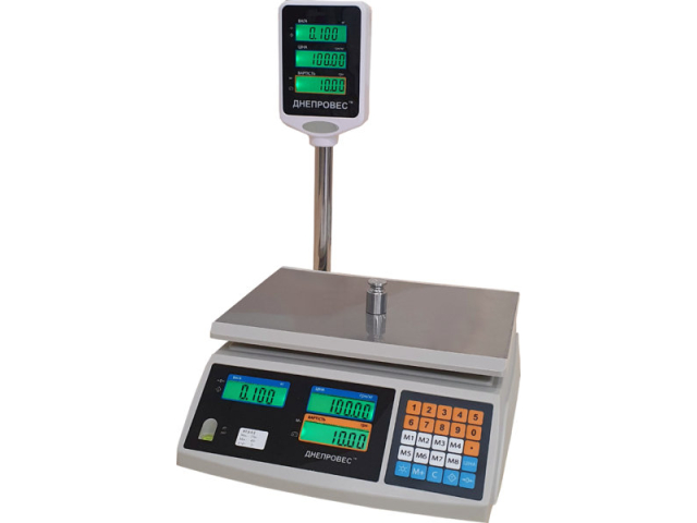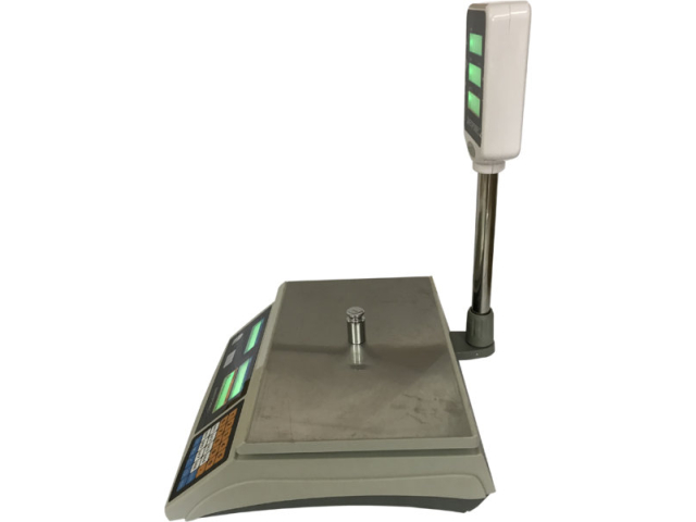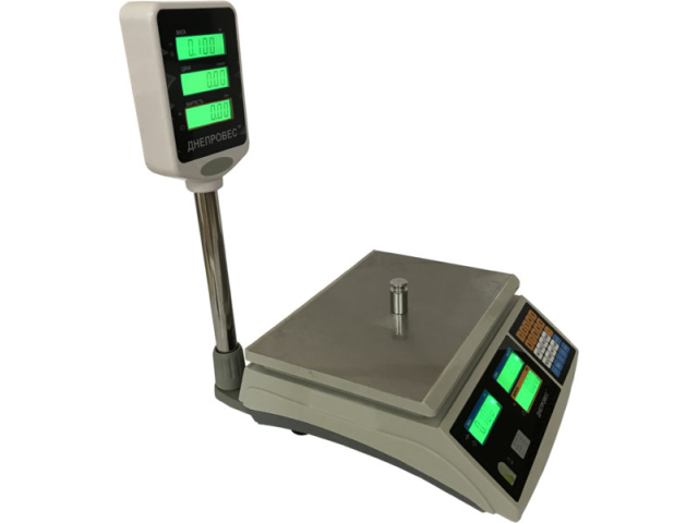 Торговые;макс.предел 3 кг;6 кг;15 кг;30 кг;;мин.предел 10 г;20 г;40 г;100 г;;точн.взвеш. 0,5 г;1 г;2 г;5 г;;Дисплей LED (Светодиодный) - двухсторонний;Стойка Да;Платформа весов: Пластиковая (с нержавеющей пластиной);аккум.время работы: до 50 час;Питание аккумулятор;сеть (220В);;Размер: платформа 305x230 мм;Масса 3.6 кг;